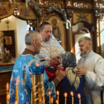 Днесь спасе́ния на́шего глави́зна, е́же от ве́ка та́инства явле́ние:/ Сын Бо́жий, Сын Де́вы быва́ет,/ и Гаврии́л благода́ть благовеству́ет./ Те́мже и мы с ним Богоро́дице возопии́м:/ ра́дуйся, Благода́тная,// Госпо́дь с Тобо́ю.